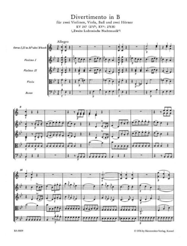 Divertimento für zwei Hörner, zwei Violinen, Viola und Bass B-Dur KV 287 (271b, 271 H) "Zweite Lodronische Nachtmusik":