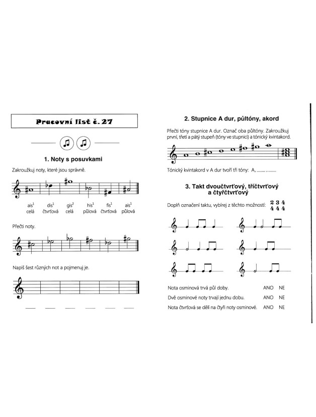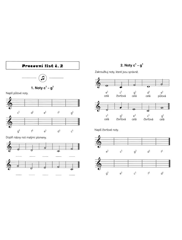 Sešit obsahuje 40 pracovních listů na procvičování not, stupnic a základních hudebních pojmů. Jednotlivé pracovní listy na sebe navazují a náročnost úkolů je přizpůsobena začátečníkům. Pracovní sešit lze využít při výuce hudební výchovy (2. stupeň ZŠ) nebo hudební nauky (1. - 3. ročník ZUŠ). Je také vhodným pomocníkem pro domácí procvičování a individuální přípravu._x000D_
