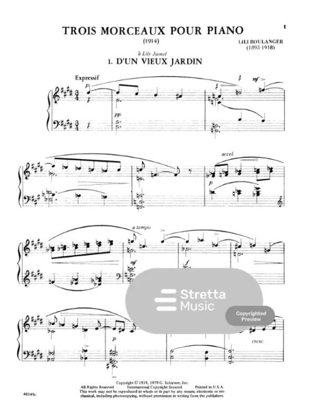 | Původní popisek | Lili Boulanger was the sister of the famous teacher Nadia Boulanger who taught Aaron Copland, Elliott Carter and Philip Glass amongst others. She was a composer for the last 10 years of her tragically short life - she died at 25 - and her music stands in the main line of French music exemplified by Faure, somewhat tinged with the influence of Debussy's Impressionism. It is generally beautiful, delicately coloured, and touching. <br><br>These 'Three Pieces For Piano' display her very personal musical signature. The first piece, <i>D'un Vieux Jardin</i> (Of an Old Garden) conjures up mystery and nostalgia. <i>'D'un Jardin Clair</i> (Of a Clear/Bright Garden) has more movement and is bathed in light. The <i>Cortege</i> is more lively without being fast. Shifting rhythmic accents, tricky runs and contrasting dynamics make this an exciting piece. |