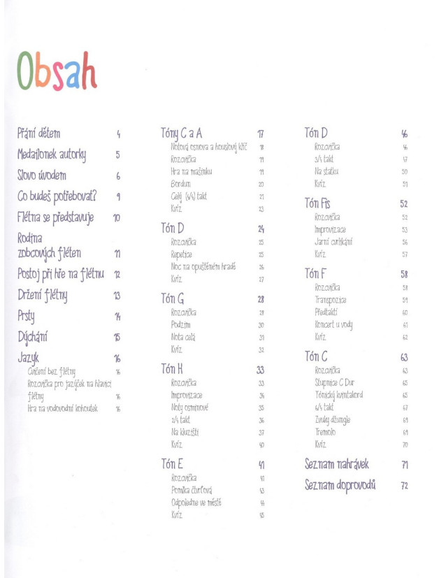 Zábavná učebnice pro malé (od cca 5 let) začínající hráče na sopránovou zobcovou flétnu plná notiček, veselých ilustrací a krásných písniček. V každé z devíti kapitol, kterými vás bude provázet rozverný skřítek Toník, se vždy nejprve seznámíte s novou látkou, kterou si budete následně moci procvičit na několika vhodných písničkách či si je vyzkoušet v rámci zajímavého zvukomalebného tématu (kvílení strašidel, hlasy zvířátek, zvuky velkoměsta apod.). Nechybí prostor ani na vlastní hudební improvizaci a každou z kapitol pak uzavírá hravý kvíz. Nemalým bonusem učebnice je odkaz ke stažení téměř 20 krásných hudebních nahrávek a 10 doprovodů pro klavír nebo cembalo (s akordovými značkami pro kytarový doprovod).